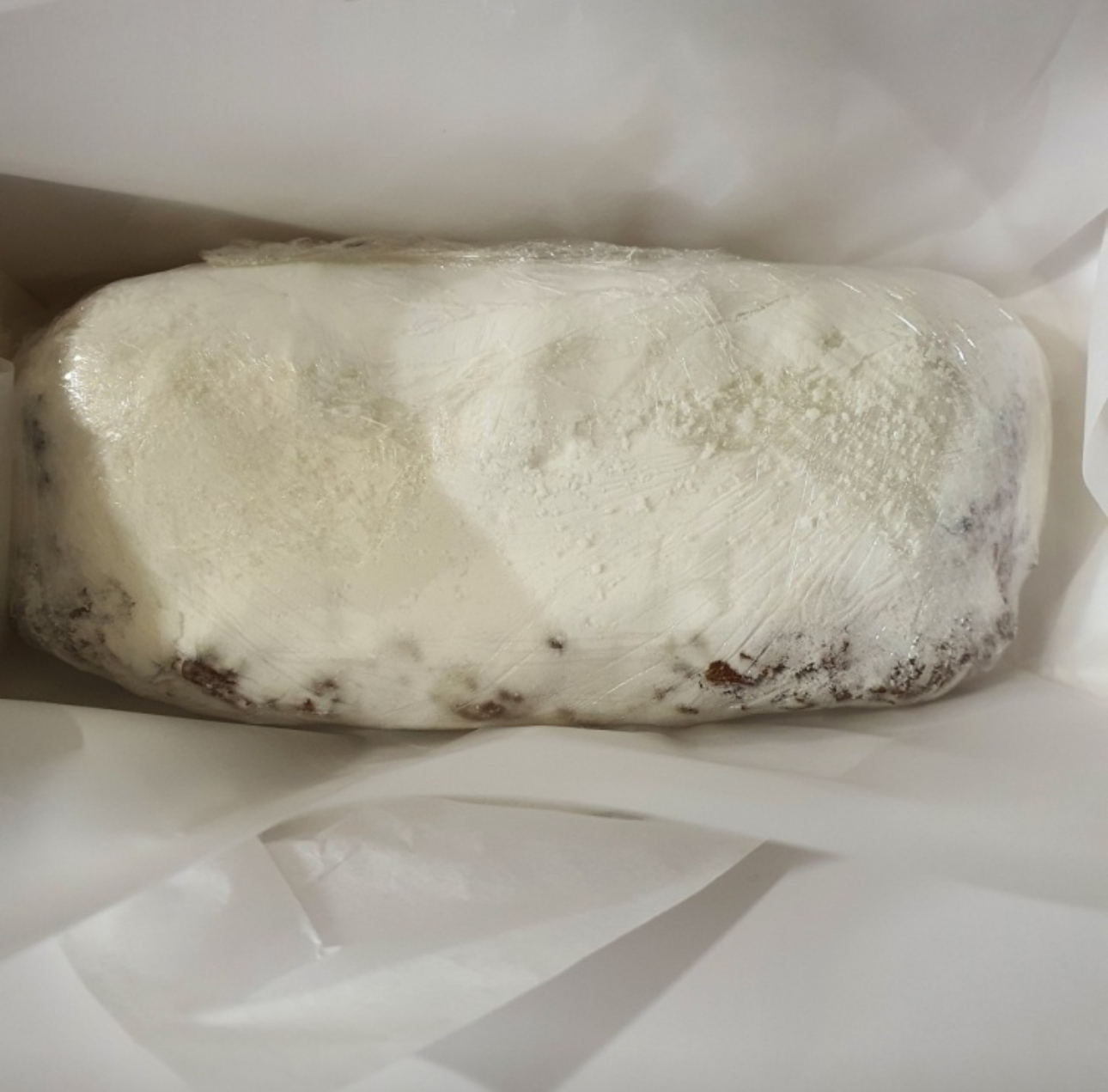 슈톨렌은 바깥 부분에 슈가파우더가 발라져 있으며 속은 촉촉한 것이 특징입니다. 때문에 한 번에 다 먹을 경우엔 어떻게 드셔도 상관없지만 원활한 보관을 위해서는 가운데부터 잘라서 드셔야 합니다.